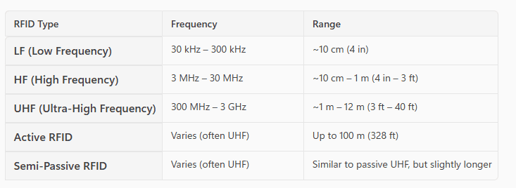 • HF (High Frequency): 3–30 MHz; good memory, used in libraries and NFC.