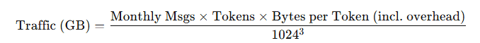 Traffic (GB) = total tokens per month × bytes per token × overhead, converted to GB